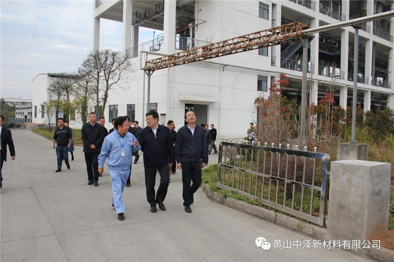 在公司总经理赵勇进的陪同下,任书记一行首先参观了公司生产车间,实地查看了生产线,详细了解产品的 生产过程、技术装备、包装及市场等情况。随后,参观调研了公司展示大厅,详细听取了总经理赵勇进讲解中泽公司发展起源以及发展历程。随后,召开了座谈会,在会上,任市长对企业的经营理念和经营模式给予了充分肯定。同时市长还表示,希望黄山中泽新材料有限公司树立更高目标,继续坚持绿色环保的经营生产理念,并在政府部门的支持下,蓬勃发展。
